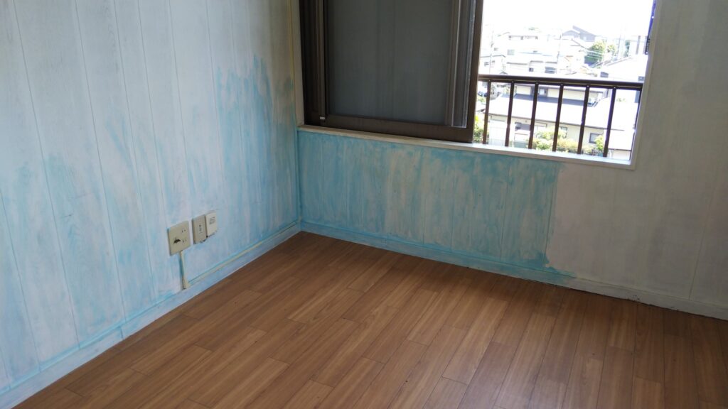 施工前は、壁の汚れや色ムラが気になる状態で、少し暗い印象のお部屋でした。